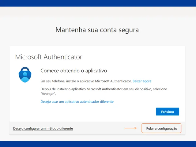 No entanto, essa etapa não é obrigatória inicialmente. Para pular essa configuração, basta clicar na frase que aparece a baixo da palavra "próximo", que diz "pular configuração".