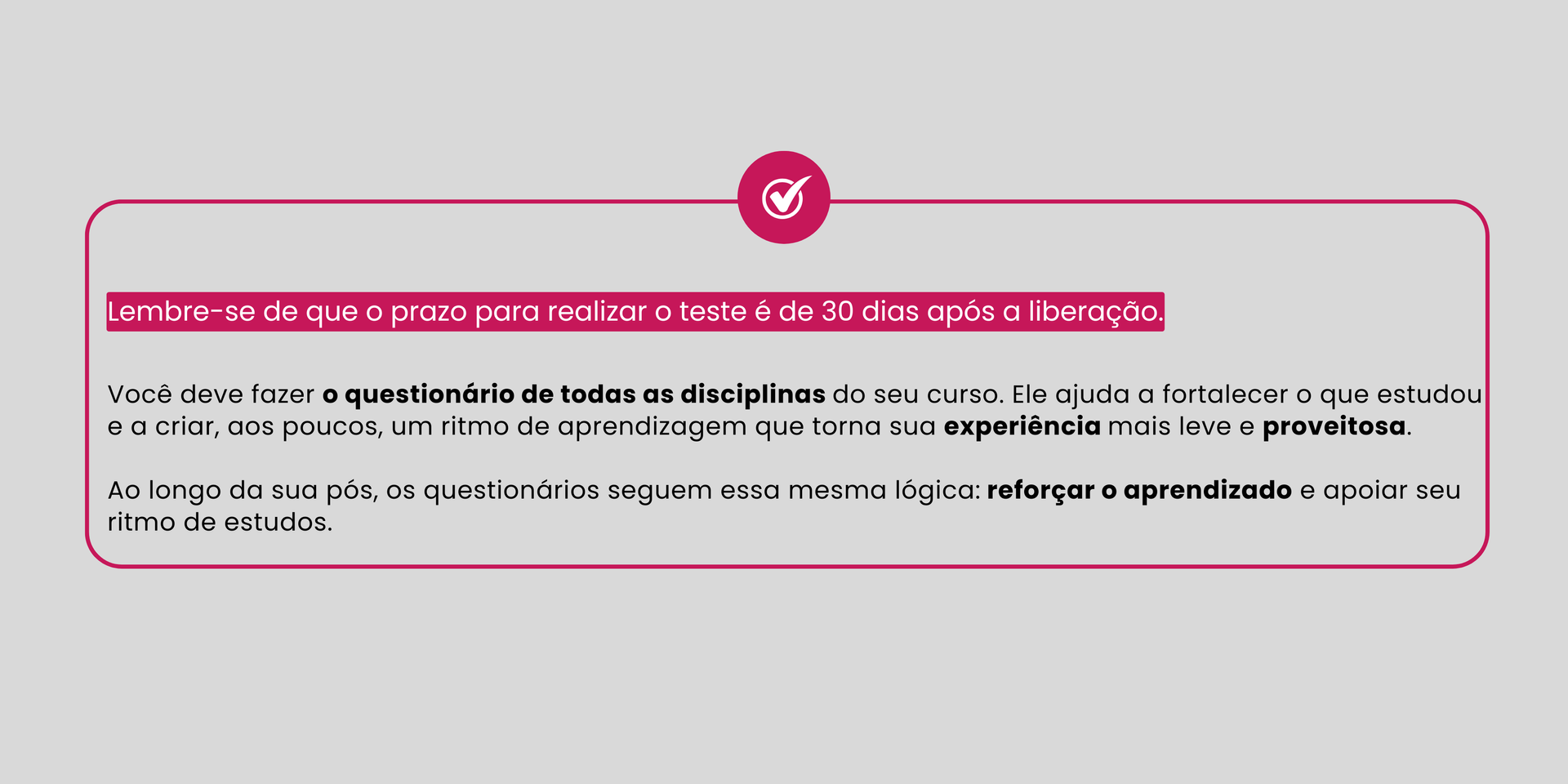 No seu curso, 30% da nota final é atribuída aos questionários, que são uma ferramenta valiosa para testar os conteúdos abordados durante as disciplinas.