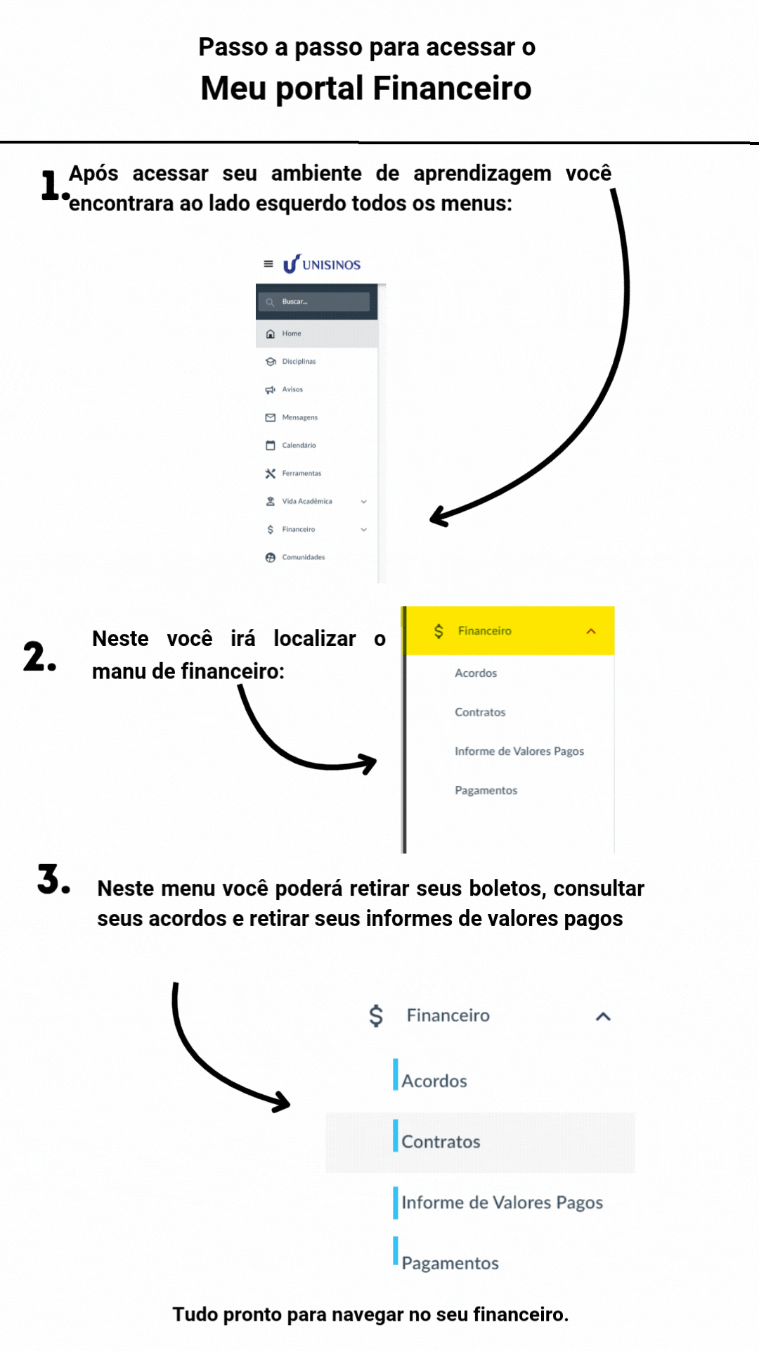 Dentro do menu, você poderá explorar diversas opções financeiras. Primeiro, consulte os "acordos" financeiros com a universidade. Depois, acesse os "contratos" dos seus cursos e verifique seu histórico de pagamentos nos "informes de valores pagos". Para finalizar, encontre e baixe seus boletos no menu de "pagamentos". Assim, você tem tudo o que precisa para uma gestão financeira eficiente.